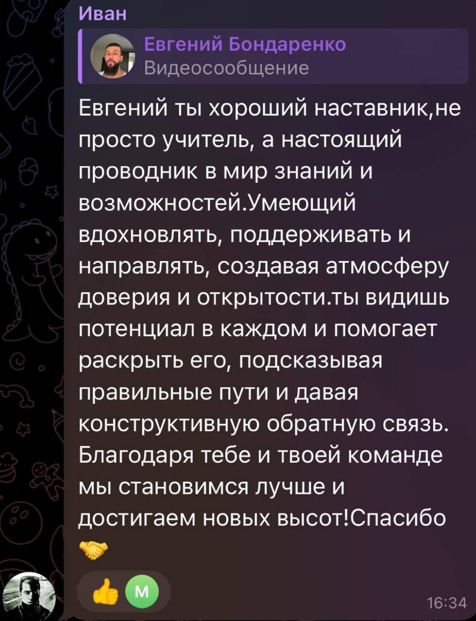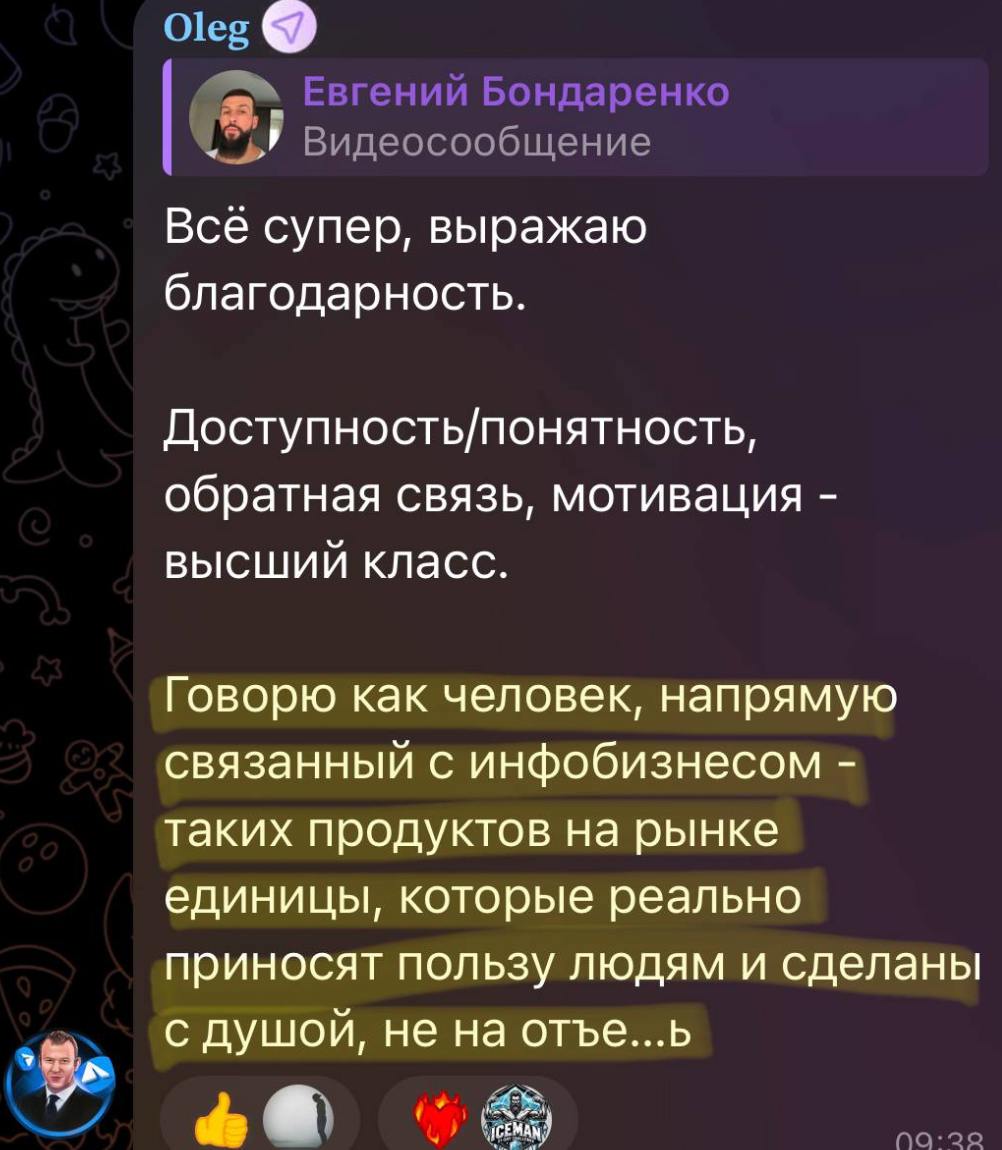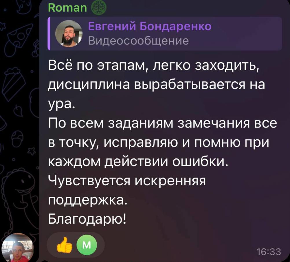 ✅ Закрытый чат группы с Евгением Бондаренко— ежедневная поддержка, общение и контроль прогресса. Здесь рождается мотивация идти до конца